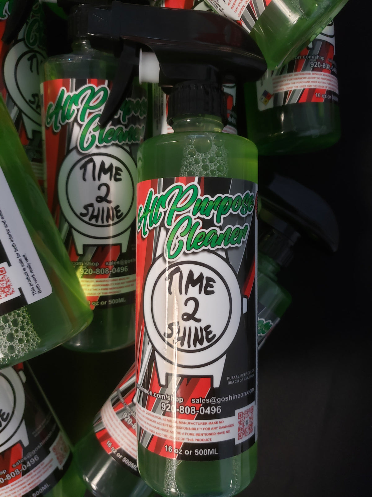 Time2Shine APC or All Purpose Cleaner is simply that. This product is safe for both interior and exterior use. Simply spray on and wipe off or spray on and wash off. Both application processes work really well.