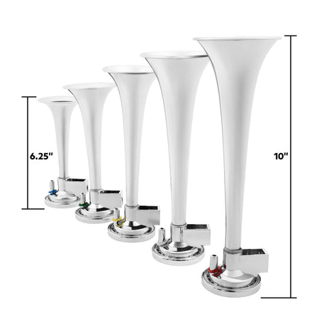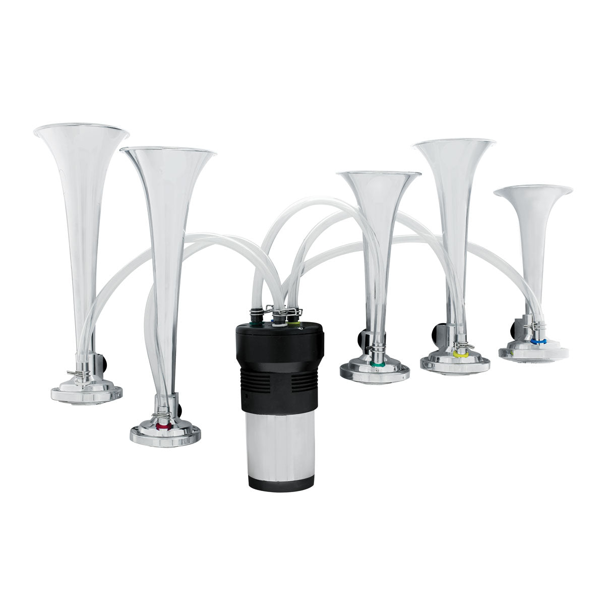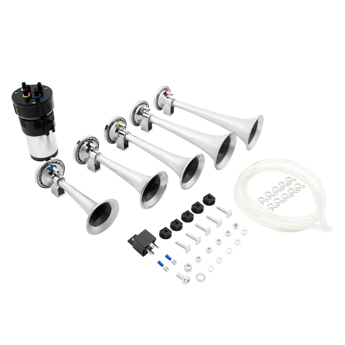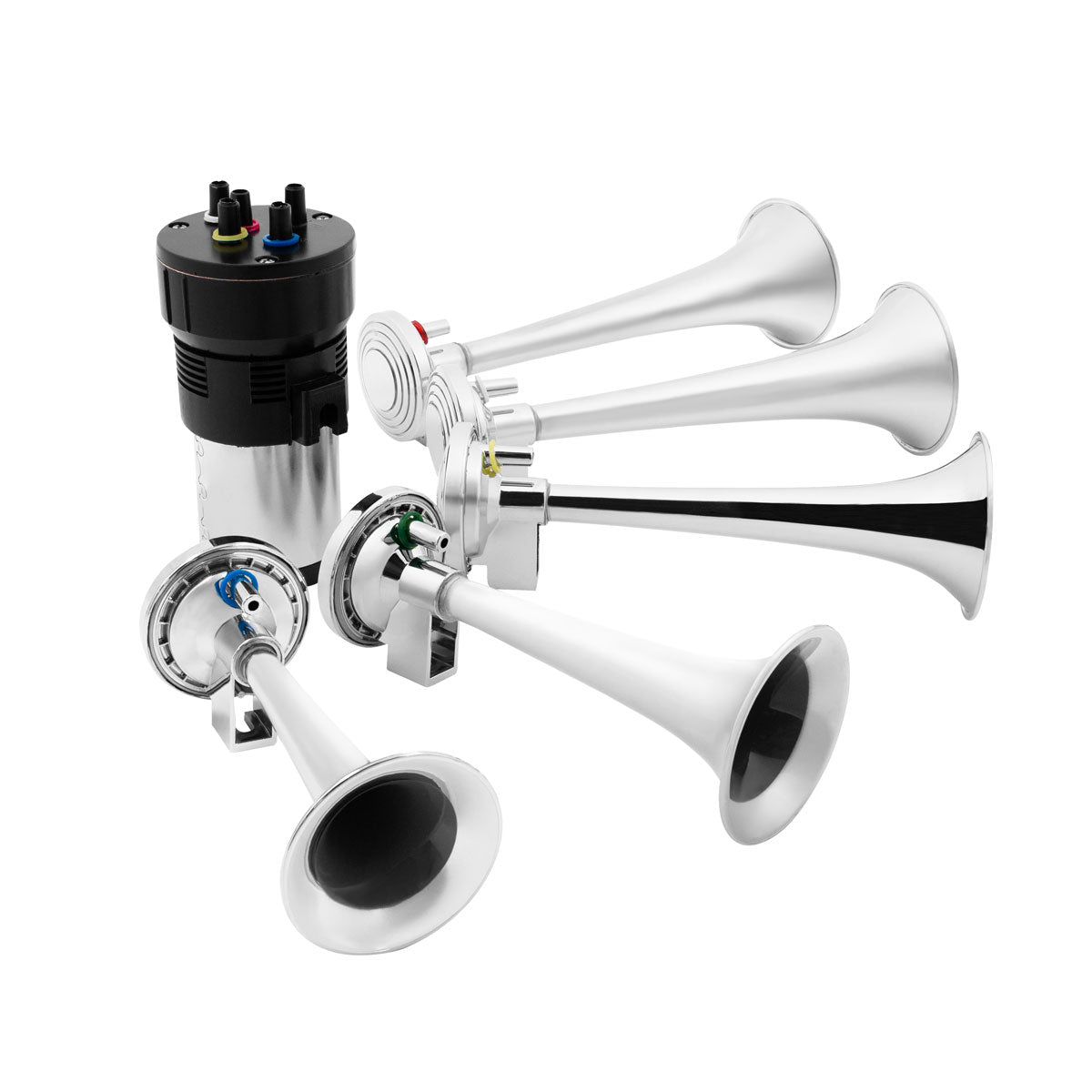 - Maintenance free heavy duty 12V air compressor with 5 durable ABS plastic chrome plated trumpet horns.