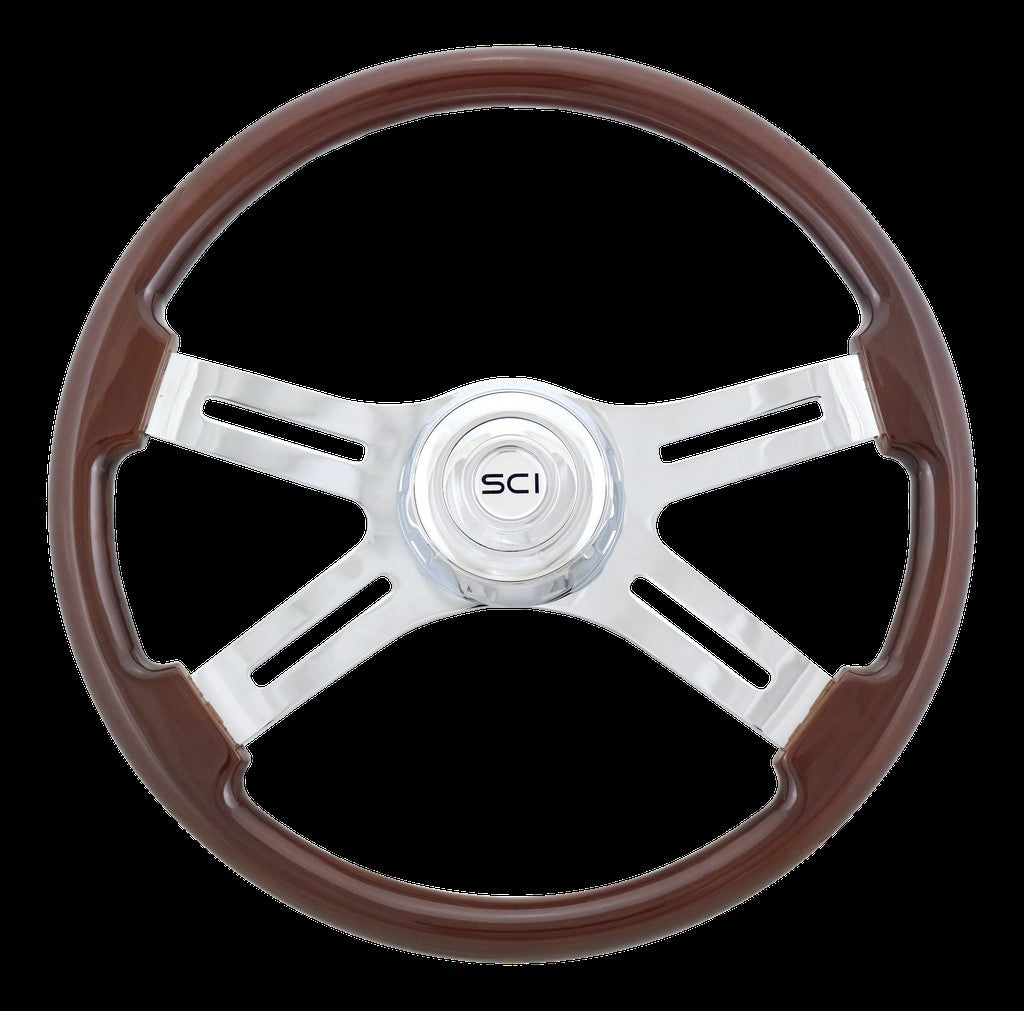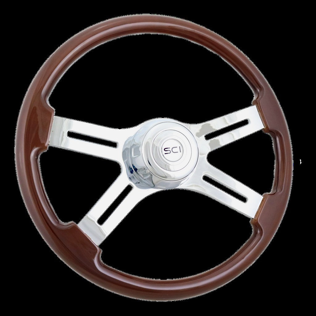 SCI Mahogany 18" classic 4 spoke Steering Wheel. Wood rim, chrome bezel and horn button.