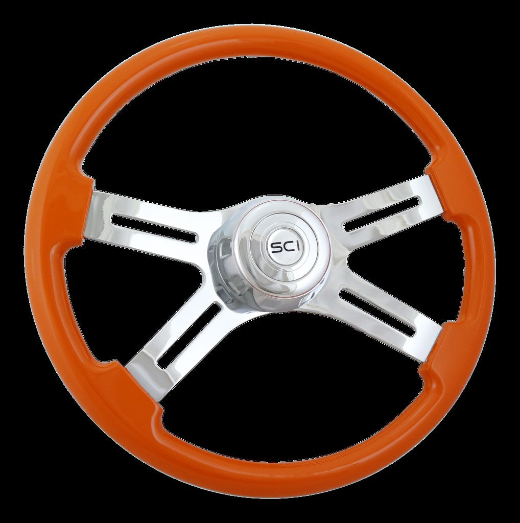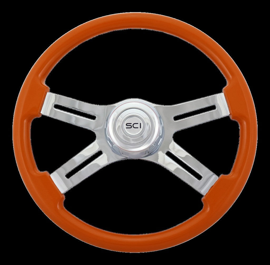 SCI Orange 18" classic 4 spoke Steering Wheel. Painted wood rim, chrome bezel and horn button.