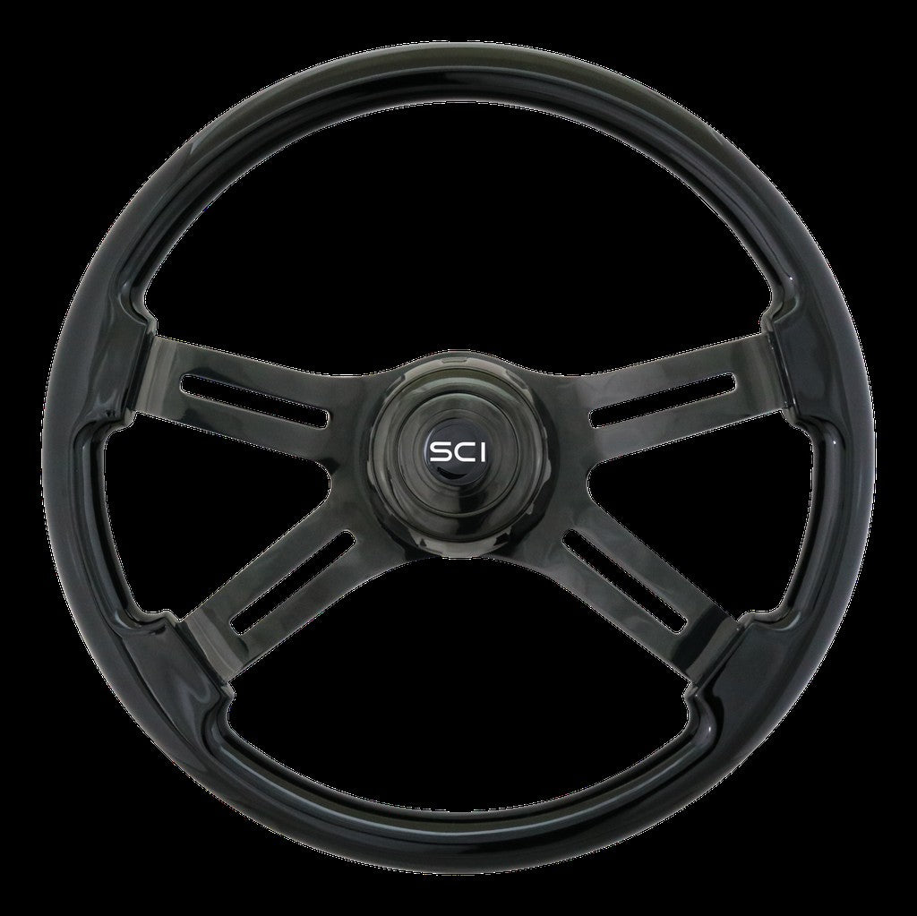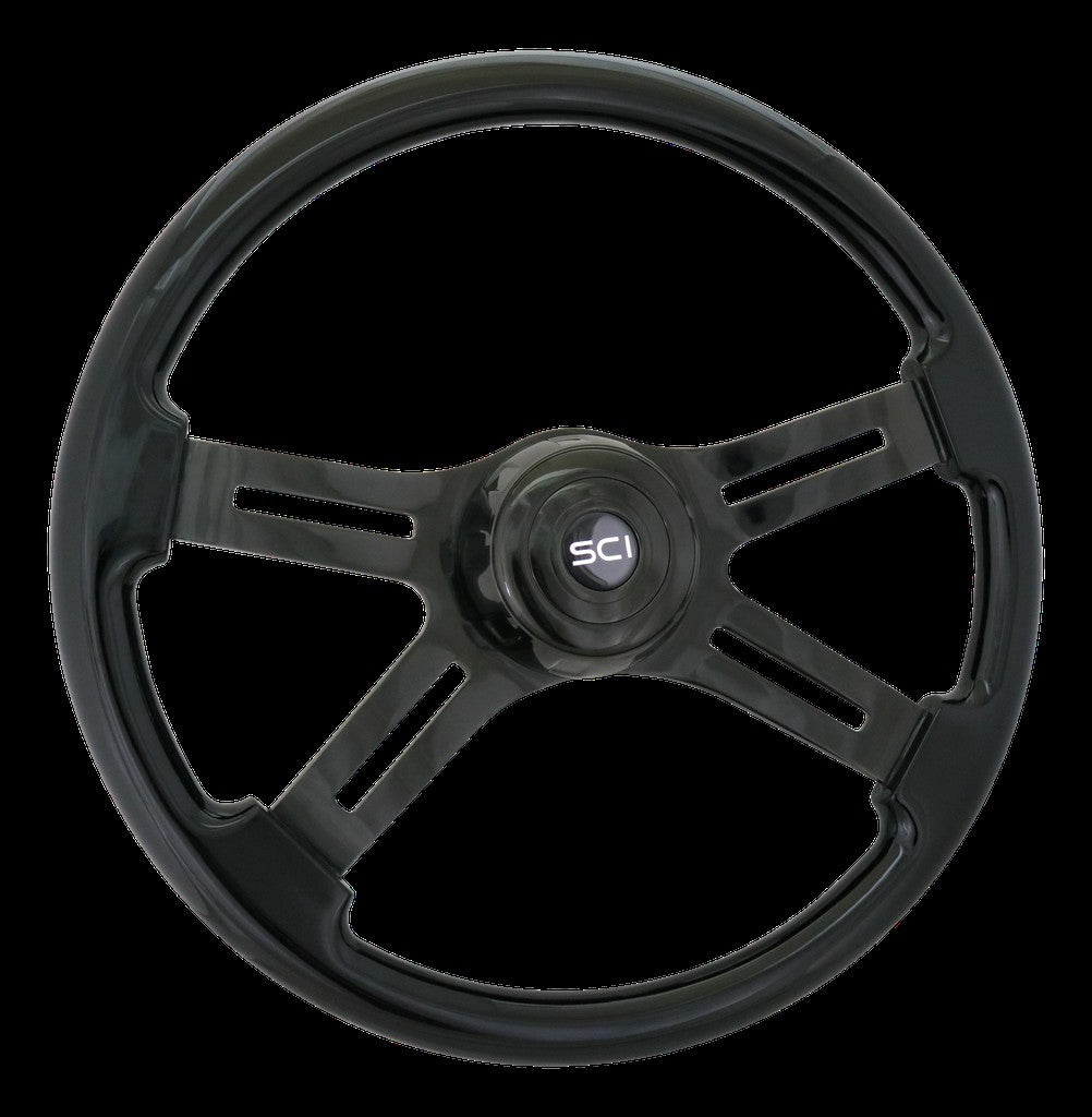 SCI Phantom Black 18" classic 4 spoke Steering Wheel. Painted wood rim, black chrome bezel and horn button.