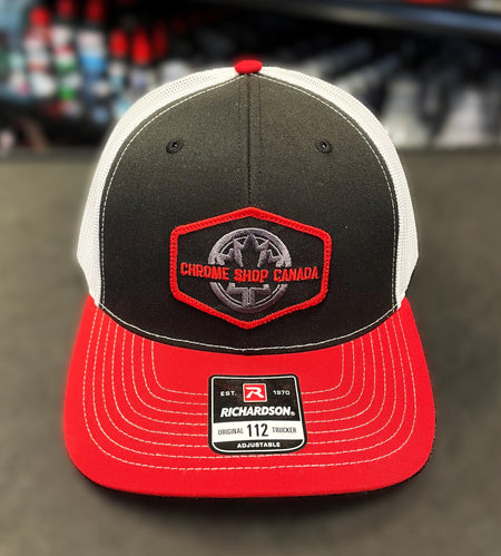 Chrome Shop Canada Patch Trucker Snapback Hat. Richardson 112 adjustable snapback. Mesh back. Black / White / Red.