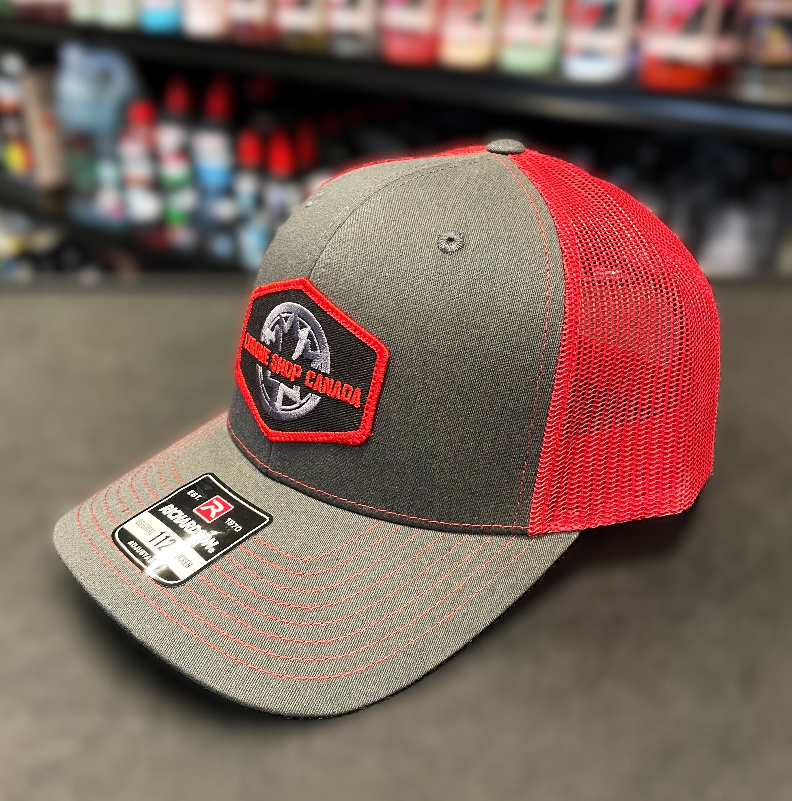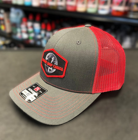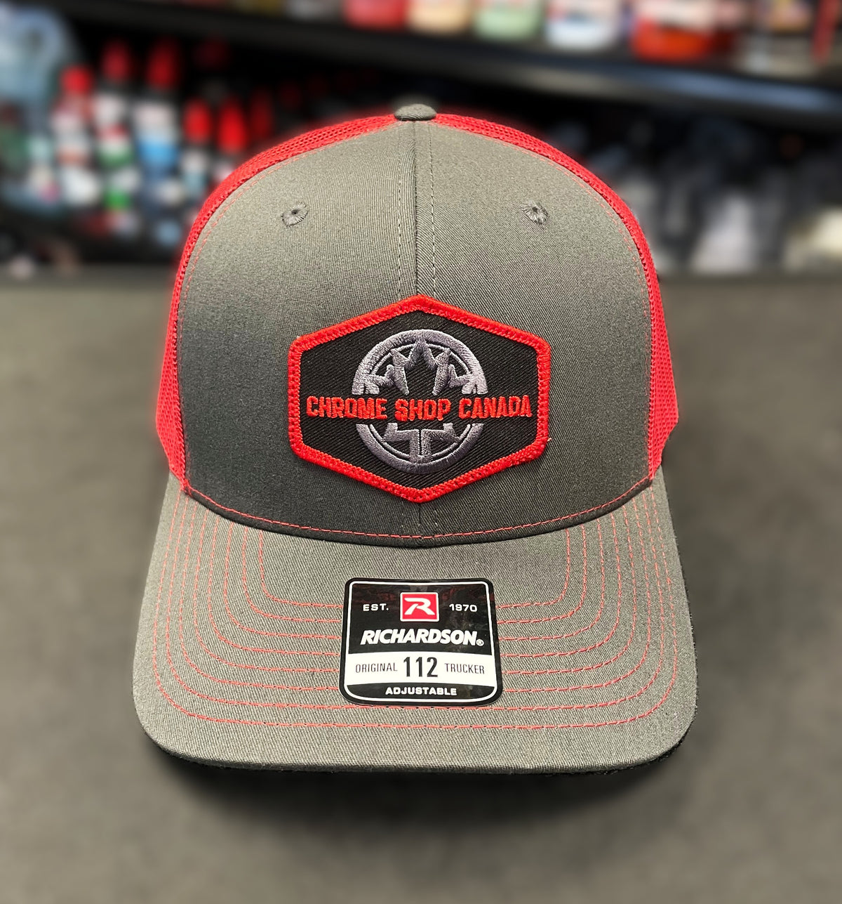 Chrome Shop Canada Patch Trucker Snapback Hat. Richardson 112 adjustable snapback. Mesh back. Charcoal / Red.