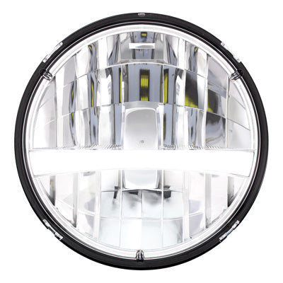 Ultralit High Power 7" LED Headlight with White Position Bar. Low Beam rated at 900 lumens. High Beam rated at 1300 lumens.