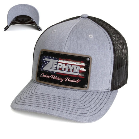 Zephyr Trucker Snapback Hat. Adjustable snapback. Mesh back. Grey / Black.